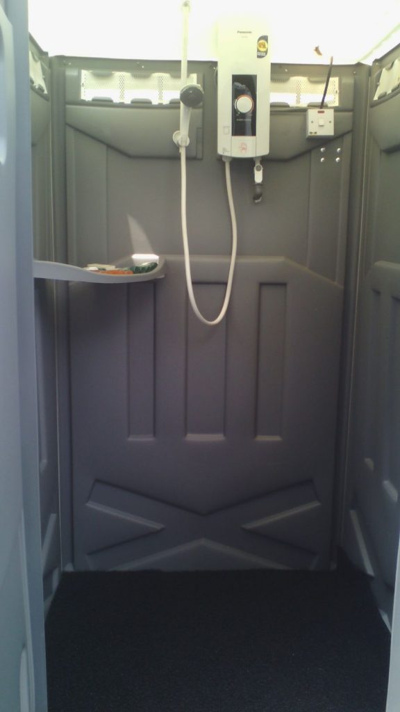 Shelves, mirror, accessories rack, shower, light, water taps, shower head, male & female sticker is available