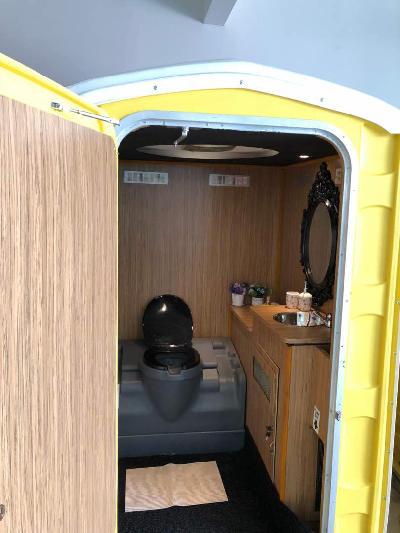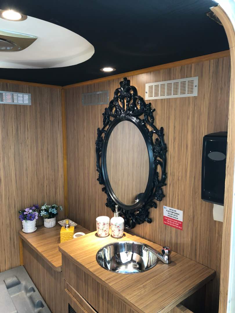 Large towel dispenser, toilet bowl, multiple coat / purse hooks, flushing system (foot pump), 83.3 litres of handwash station, soap dispenser, over-sized mirror, motion-activated light, anti-bacterial toilet seat cleaner, anti-bacterial carpet, trash bin, air freshener, air cooler (upon request), male & female sticker is available.